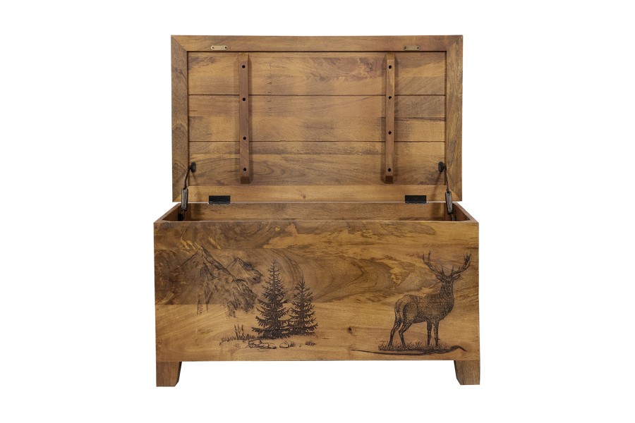 The Alpine solid mango wood trunk features a black laser-etched scene of mountains, trees, and an elk. This unique burning technique creates a one-of-a-kind piece perfect for a rustic lodge look. With a flip-top opening, this unique piece provides plenty of storage.