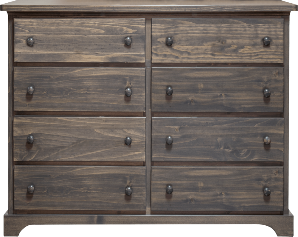 Solid pine dresser made in British Columbia. Part of the Polo collection with bed, nightstand, dresser, and chest options. Available unfinished, factory-finished, or custom-finished. Shown and priced factory-finished (in 'Clay').