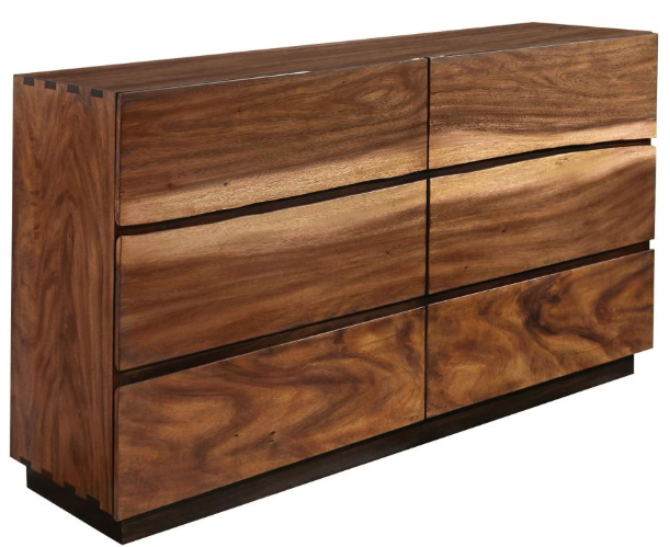 Add a striking, creative touch to a master bedroom. With eye-catching wood patterns and natural accents, this dresser really stands out. Its smokey walnut and coffee bean finish are enhanced by artsy, faded wood accents. Six spacious drawers allow ample storage options to keep your space organized.