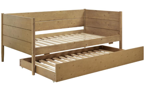 The transitional-style panel daybed with trundle features a natural brown finish that highlights its rustic charm and versatile appeal. Constructed from pine wood, plywood, and pine veneer, this piece combines durability with timeless design. The natural wood variations, interacting with the applied finish, make each piece truly unique. Included slats provide sturdy mattress support, while the trundle, equipped with four wheels, glides smoothly for convenient additional sleeping space.