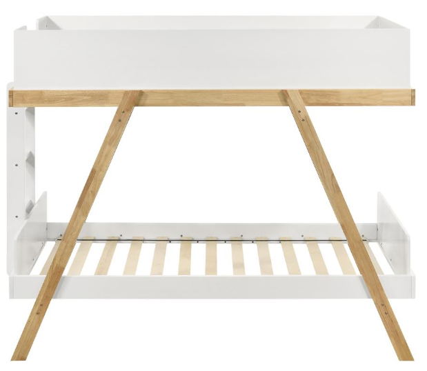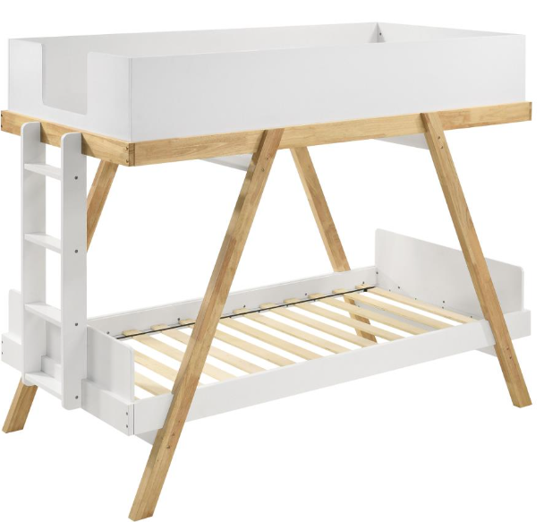 Refresh a bedroom with the farmhouse charm of a modern bunk bed with a twin-over-twin configuration. It takes design inspirations from a classic trestle, complete with angled supports and a two-tone finish that highlights its character. The upper bunk is surrounded on three sides with solid panels, adding safety. Its attached ladder provides access through the footboard. The lower bunk is open, with low head and footboards that add a finished look and feel