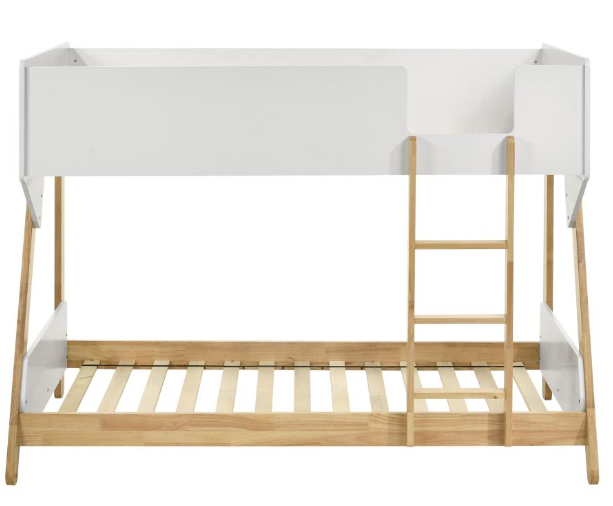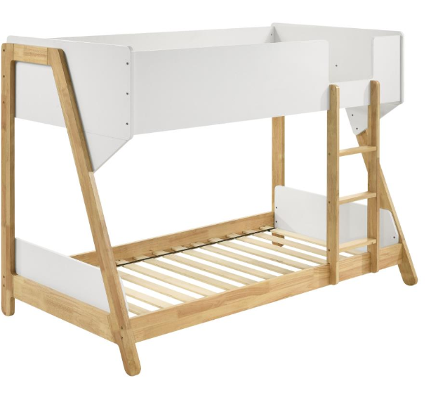 Stylish wood construction and a two-tone design highlight this modern twin bunk bed set. Perfect for a kid's bedroom, it offers two twin beds while saving floor space for playing. The bed features an angular frame and a natural wood finish, with white accents on the head and footboards and rails. An attached ladder provides access to the top bunk, which includes guard rails. It's a fantastic solution for siblings sharing a room or for sleepovers