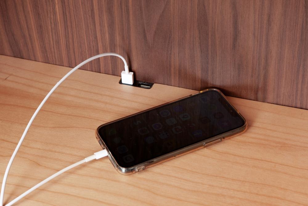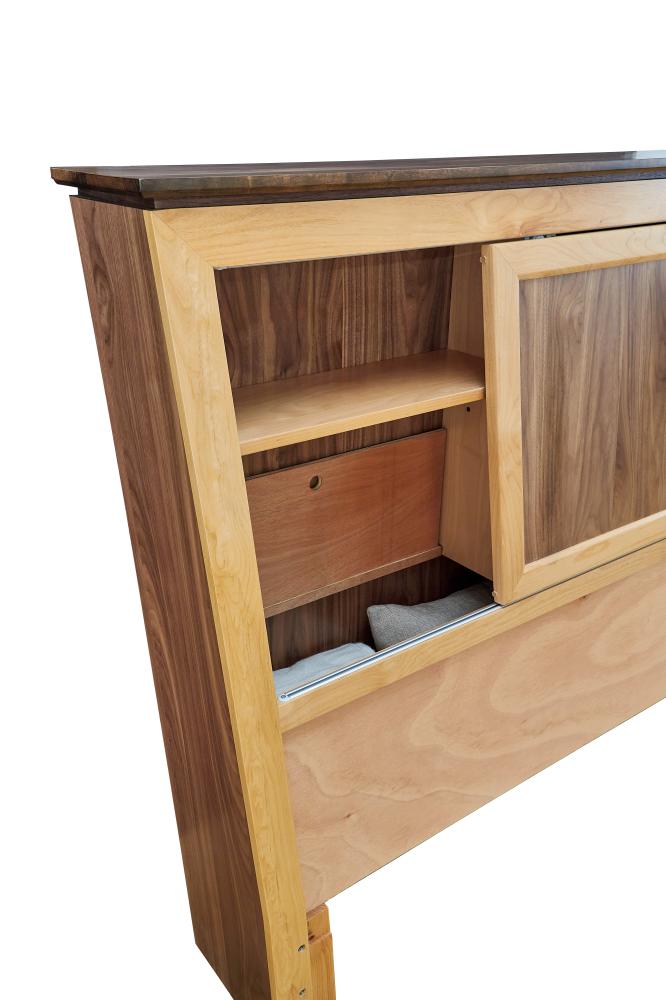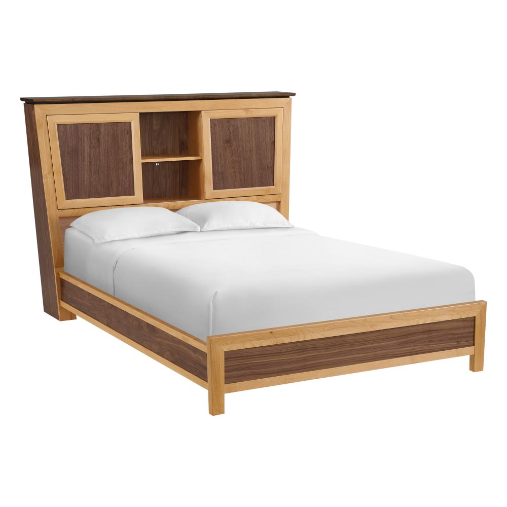Mid-Century styling with a dramatic flair all its own. Made from certified sustainable American Alder and Black Walnut veneered hardwoods. Soft-close sliding doors open to reveal concealed storage areas. The hinged shelf in outer cubbies reveals additional concealed storage areas. The headboard features dual port USB—three cubbies with fixed shelves.
