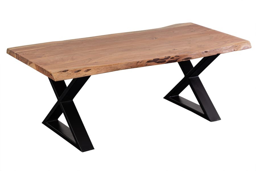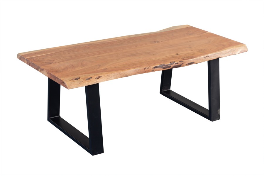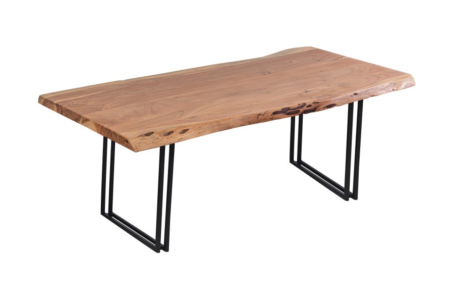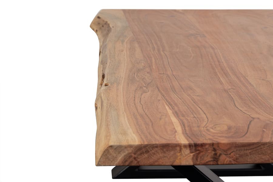 Made from sustainably sourced acacia wood, the variation in grain, color, and texture makes each piece one of a kind. Architectural metal bases can be mixed and matched for personal customization. Handcrafted by artisans to create a live edge finish, this beautiful solid wood collection features heirloom quality furniture built to last a lifetime. A clear light gloss finish over solid acacia wood highlights the natural beauty of the wood grain.