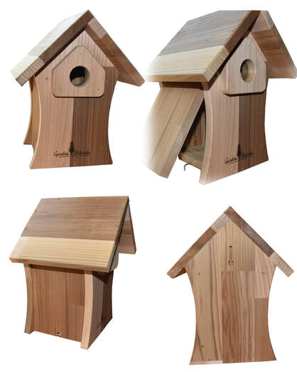 All Garden Artworks Nest Boxes are made using clear western red cedar. They feature openings for ventilation, pivoting sides or fronts for cleanout, and drainage holes in the bottom. All boxes are assembled with wood screws.