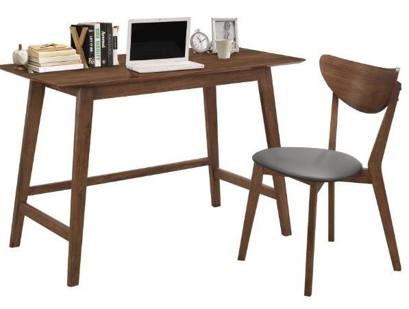 Make this two-piece desk set work for your home space. Styled to maintain a low profile, it's functional and fashionable. Solid hardwood is among materials used to shape a slightly retro-shape desk with slant legs. A mid-century modern flavor also makes the chair a delightful choice. A cool walnut finish is both versatile and beautiful, and a grey leatherette upholstered seat adds an enticing element to the chair.