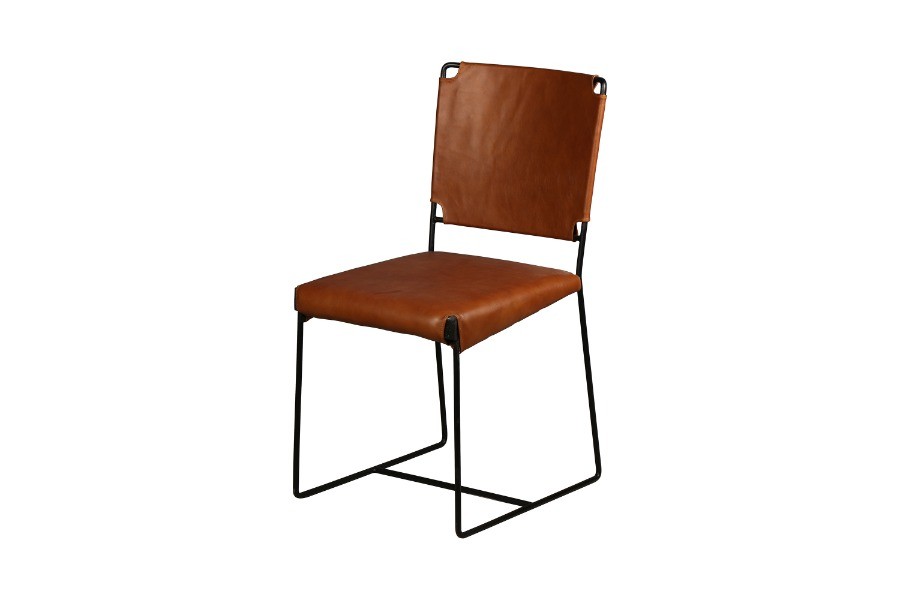 Mixing the warmth of camel colored leather with black metal legs, this sleek chair is both rustic and modern. The back of the chair features a double corseting motif with leather cord which adds a one-of-a-kind touch to this comfortable and unique chair.