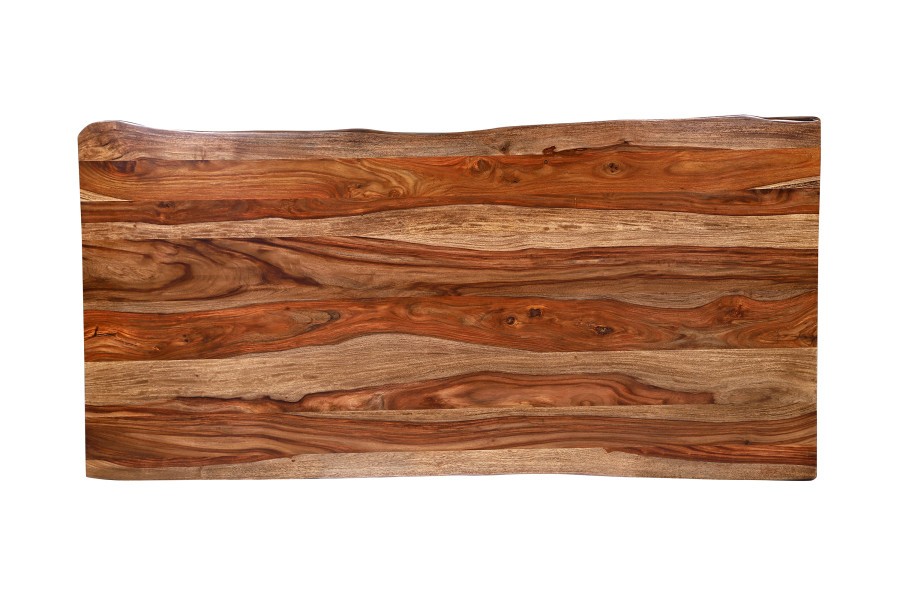 Made from sustainably sourced Sheesham wood, the variation in grain, color, and texture makes each piece one of a kind. Architectural metal bases can be mixed and matched for personal customization. Handcrafted by artisans to create a live edge finish, this beautiful solid wood collection features heirloom quality furniture built to last a lifetime. Available in 'Harvest' and 'Midnight' factory finish.