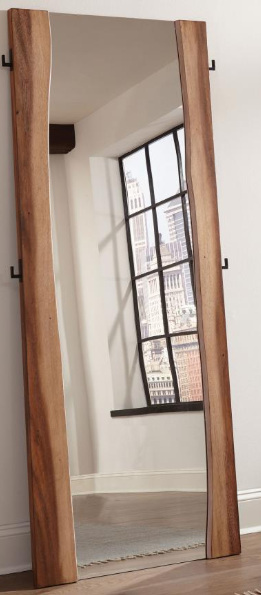 Fashionable and functional, it features a striking wooden frame in an appealing, smokey walnut and coffee bean finish. Curvy edges between the frame and mirror give it an eye-catching look. This mirror's metal brackets allow you to easily affix it to any wall, making it ideal for a bedroom or walk-in closet.