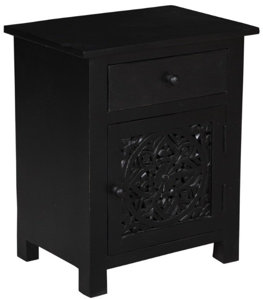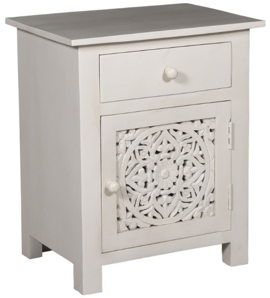 This beautiful nightstand is hand-carved from solid mango wood by artisans. Featuring a traditional floral motif, this elegant white stained piece is truly a piece of art. Available in Black or White.
