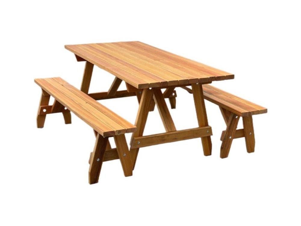 This sturdy and roomy picnic table and bench set is a great place to gather with family and friends for an outdoor BBQ or conversation. Douglas Fir is known for its strength, durability, and ability to withstand the elements. It has rich coloring ranging from dark tan to light tan. Beautiful AND Heavy Duty!! Made with Vertical Grain Douglas Fir stained with Sun Frog Deck Sealer in a cedar tone. Made in Idaho, USA